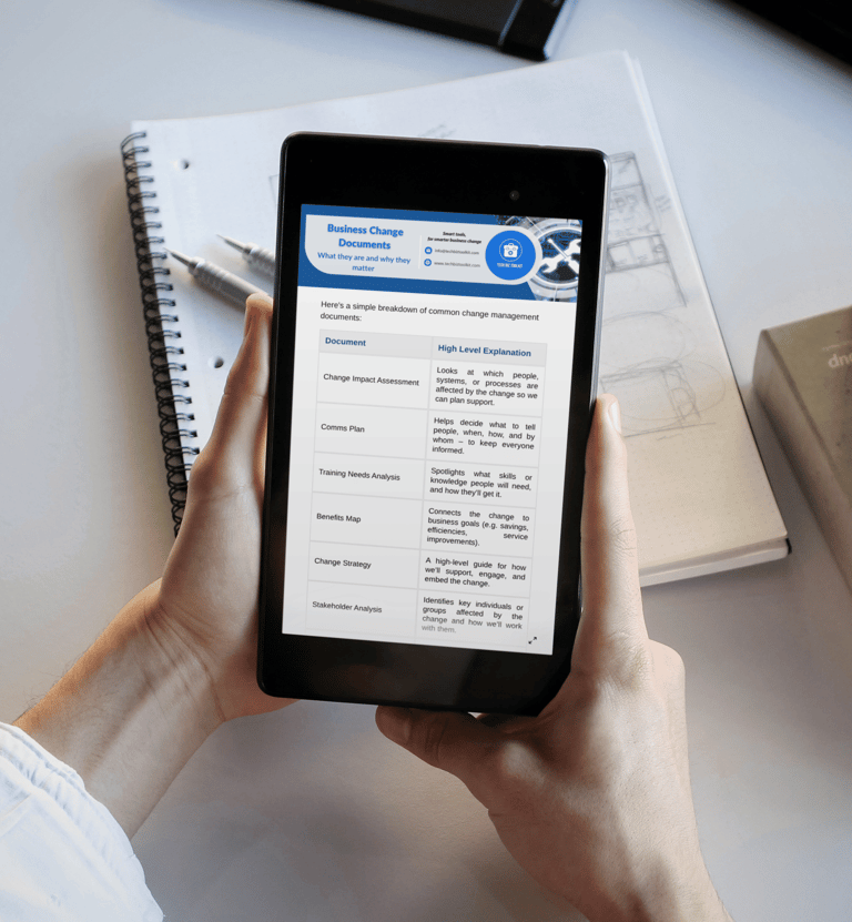 This one-pager explains 9 essential Business Change documents in plain English. Perfect for onboarding new stakeholders, supporting junior team members, or keeping your project focused.